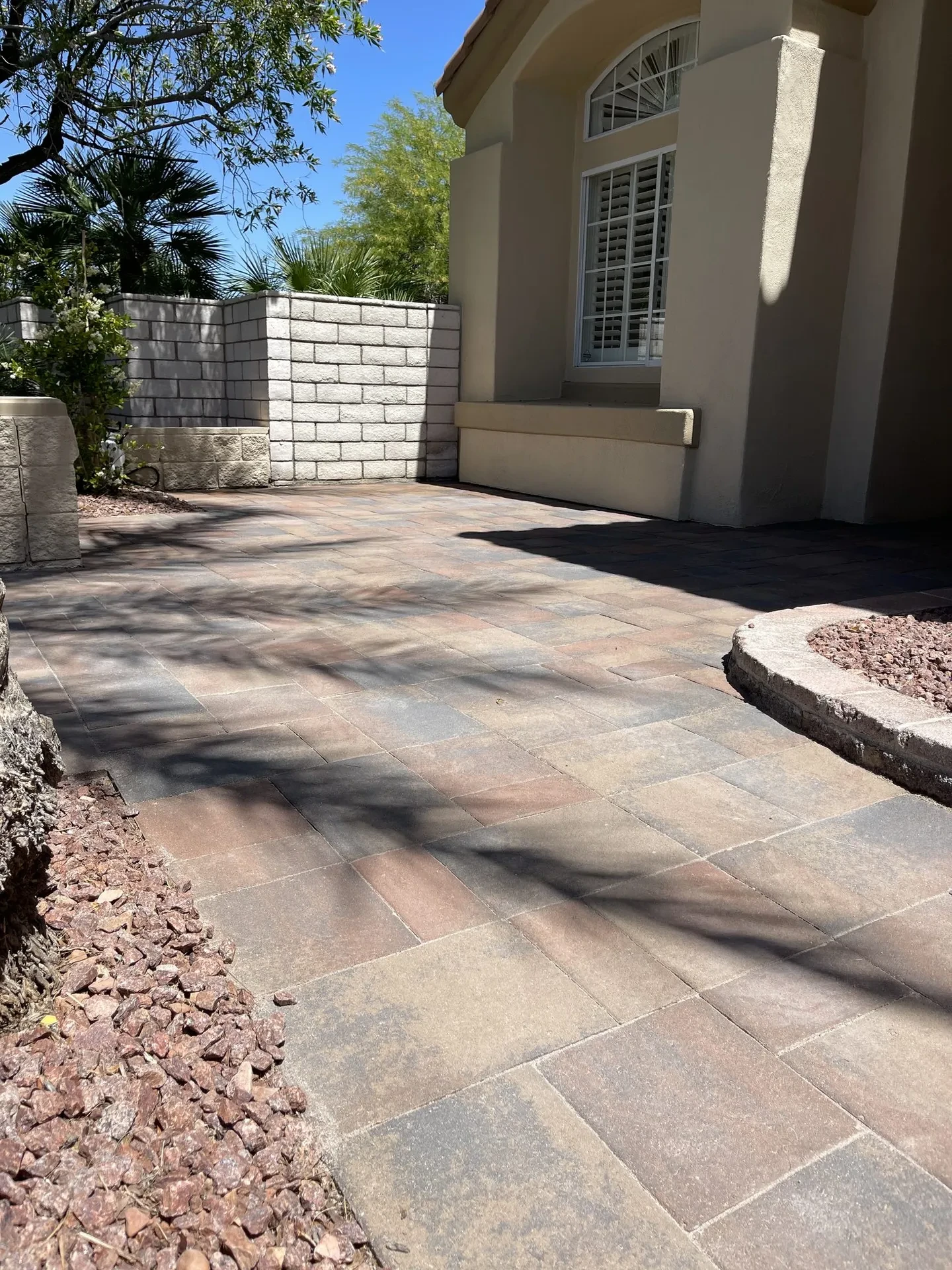 Las Vegas heat, UV, and monsoon rains degrade unsealed pavers fast — fading color, loosening joints, and letting weeds take over. We handle the full process: pressure wash, stain removal, polymeric sand stabilization, and professional sealer application. Your pavers come back looking new and stay protected.